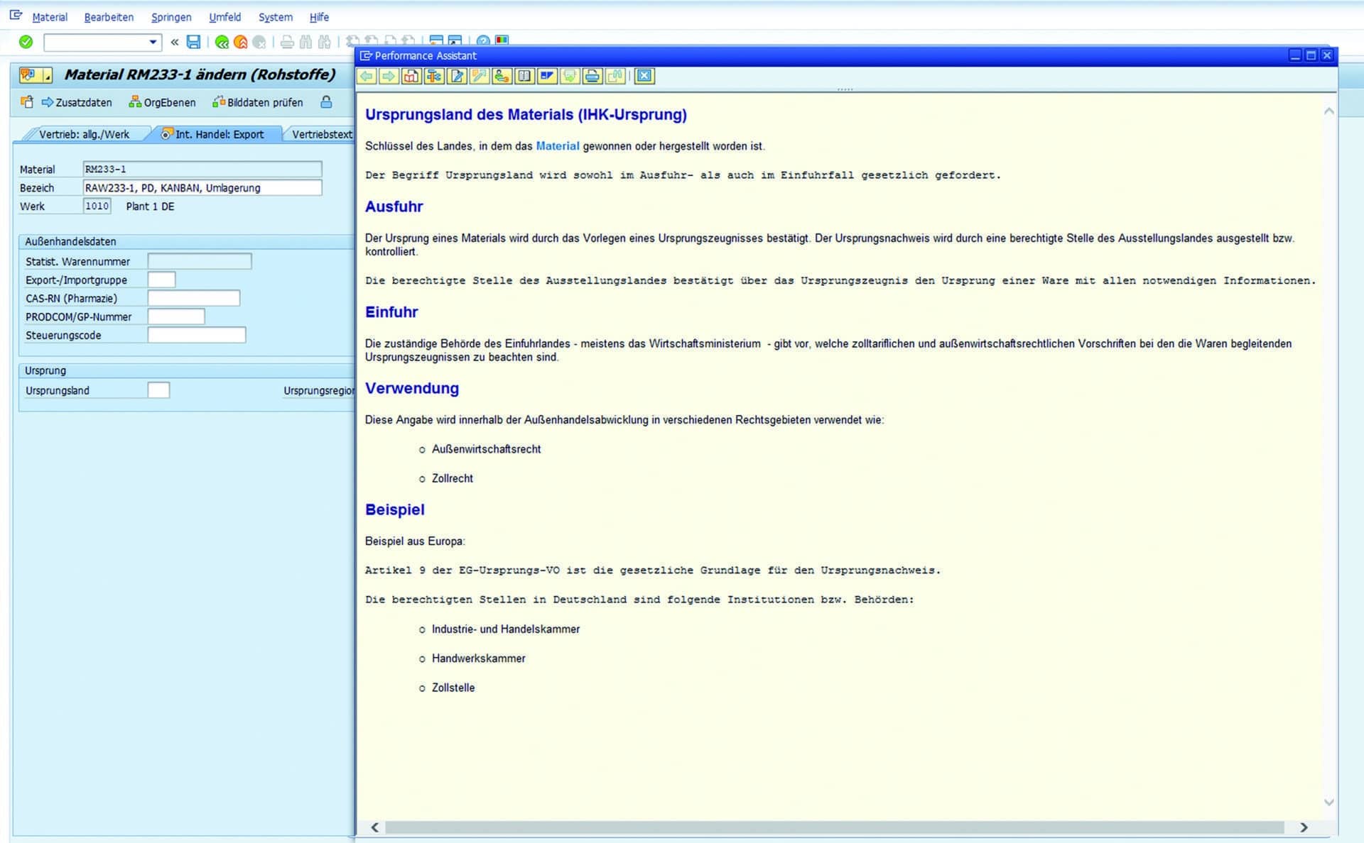 Im Materialstamm existiert, auch in S/4HANA weiterhin nur ein Feld für das Ursprungsland. S/4HANA kennt nur den handelsrechtlichen oder auch nichtpräferenziellen Ursprung. Ein Feld für den präferenzrechtlichen Ursprung wurde nicht eingeführt. Der Hilfetext zu dem Feld Ursprungsland ist ebenso gleichgeblieben. Die Hilfe-Erklärung zum dem Feld verwendet leider nicht die von offiziellen Seiten definierten Begriffe. Es wird hier der umgangssprachliche Begriff IHK-Ursprung verwendet. Tatsächlich bieten die IHKs einen Service um den handelsrechtlichen Ursprung, meist auf Basis von Handelsrechnungen zu bestätigen.