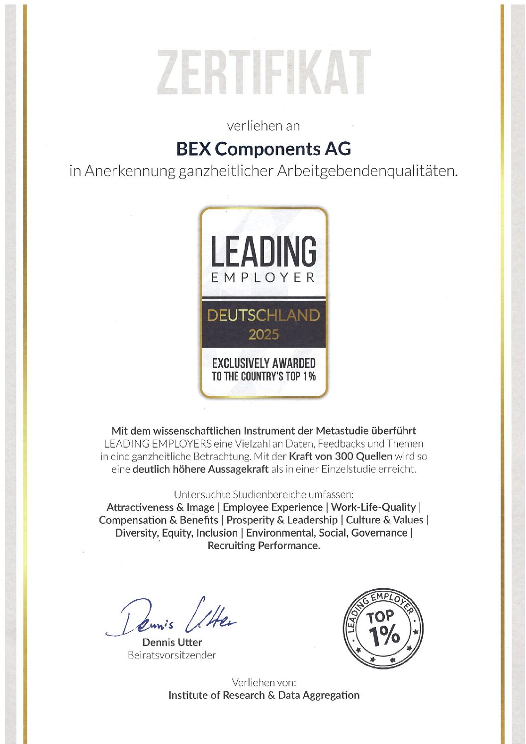 Und zu guter letzt wurden wir gleich zu Beginn von 2025 von Leading Employers als einer der Top 1 % Arbeitgeber ausgezeichnet wurden! Diese Anerkennung bestätigt unser Engagement für eine wertschätzende Unternehmenskultur, hervorragende Arbeitsbedingungen und Entwicklungsmöglichkeiten für unsere Mitarbeiter.