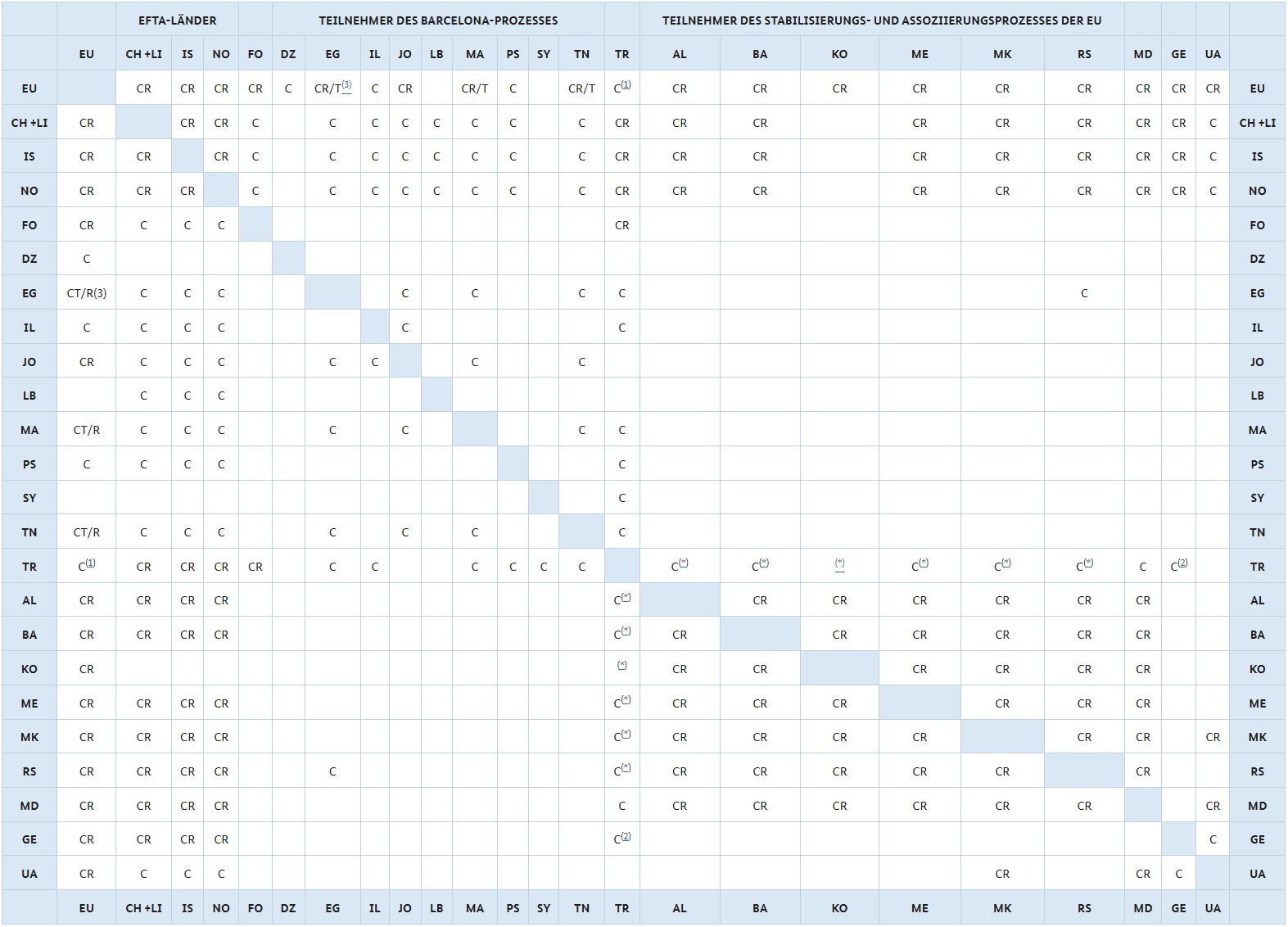 Zusätzlich hat der Gemischte Ausschuss des Regionalen Übereinkommens am 12. Dezember 2024 eine Verlängerung der bisherigen Regeln des Regionalen Übereinkommens neben weiteren Übergangsbestimmungen beschlossen. Damit ist die Verwendung der bisherigen Regeln für ein weiteres Jahr möglich, sofern die Abkommens-Parteien diese Übergangsbestimmungen auf nationaler Ebene ratifiziert haben. Die Ratifizierung der Übergangsbestimmungen gemäß Beschluss Nr. 2/2024 wird in der Matrix der Kumulierungsmöglichkeiten mit „CR“ gekennzeichnet. Abkommen, die noch auf dem alten Regelwerk basieren, sind in der Matrix mit „C“ gekennzeichnet.