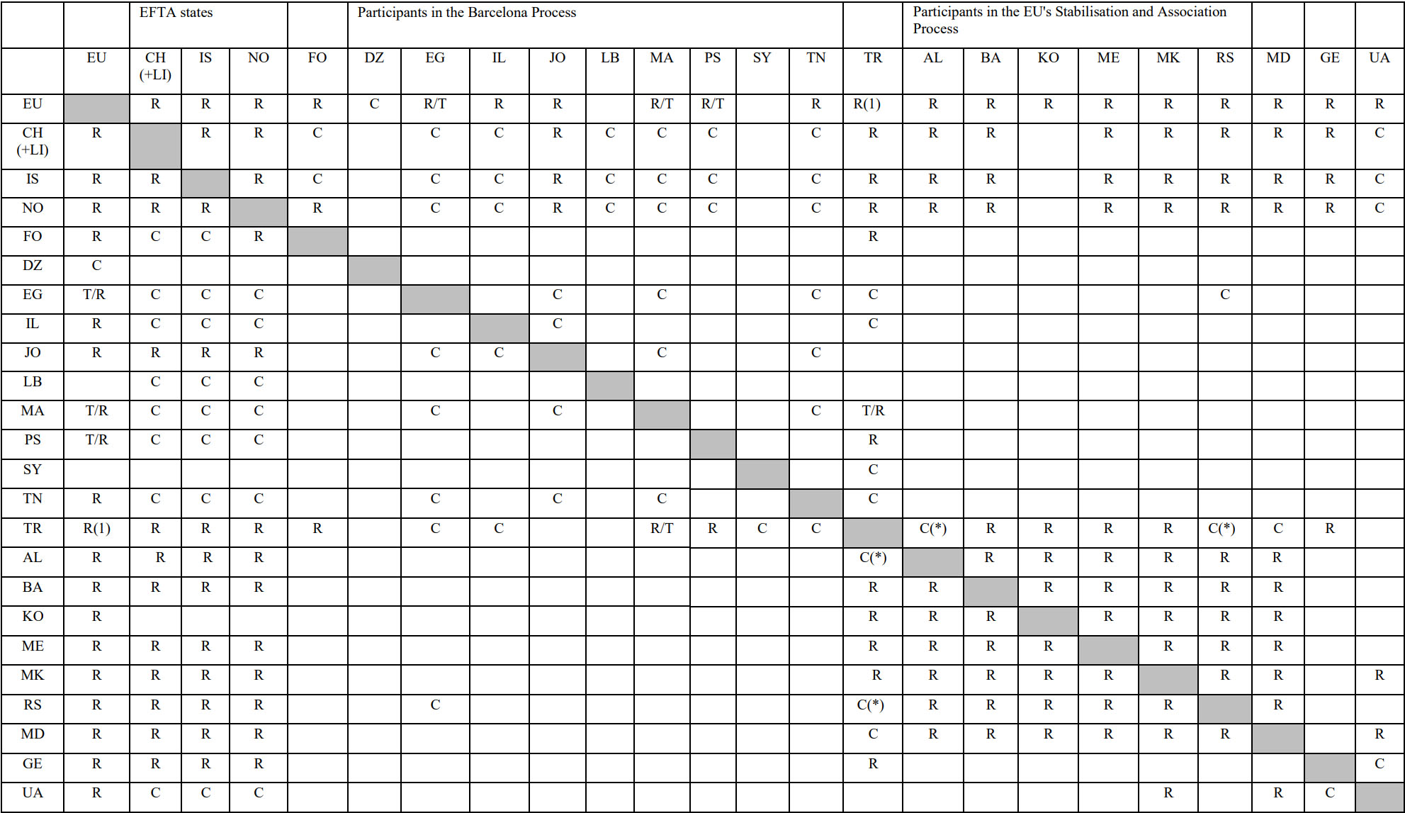 Am 1. Januar 2026 endeten die Übergangsbestimmungen und seither gelten für die Abkommen, die mindestens ein „R“ in der Matrix haben die revidierten Regeln des Regionalen Übereinkommens. Aktuelle Informationen erhalten Sie auf der Seite der EU.