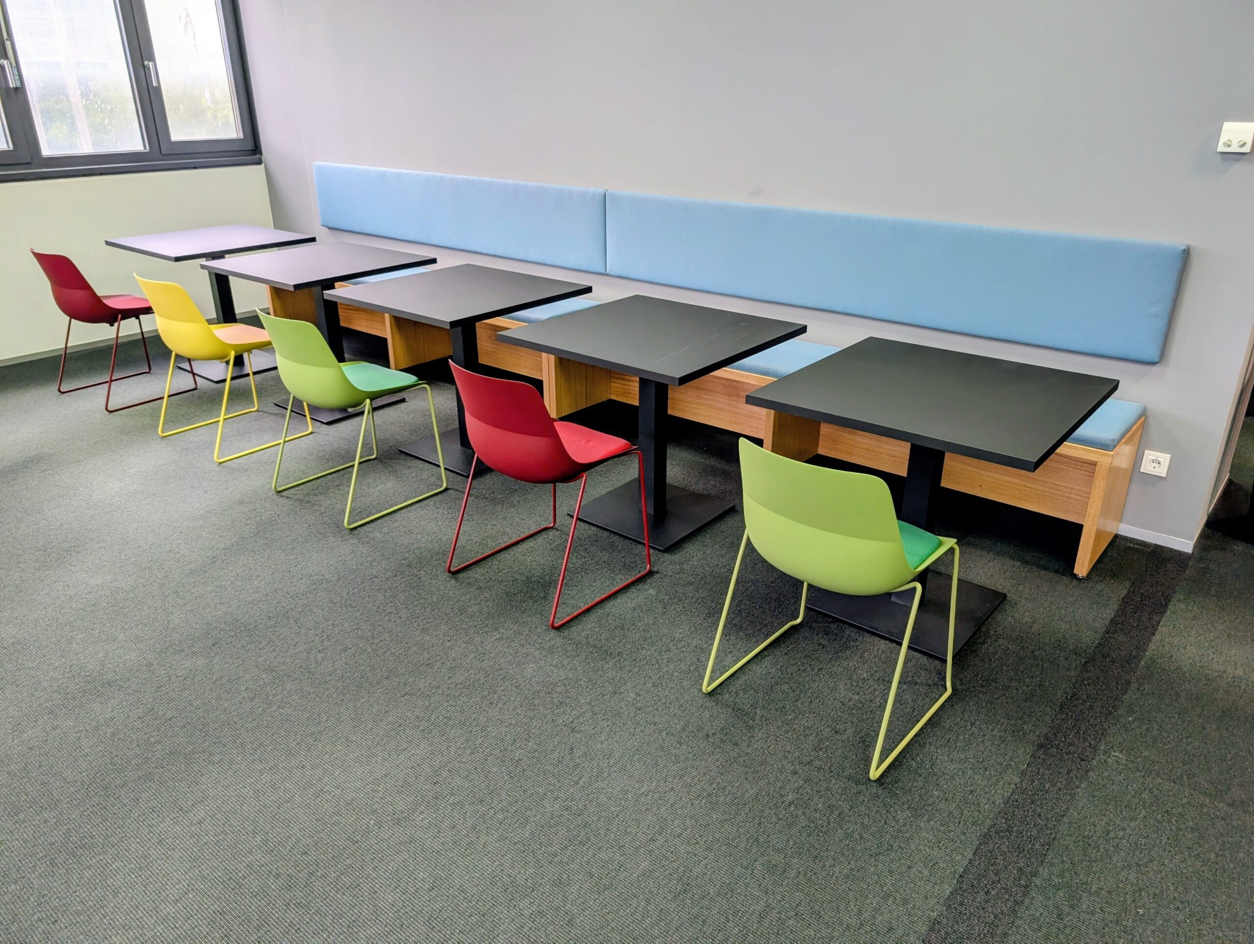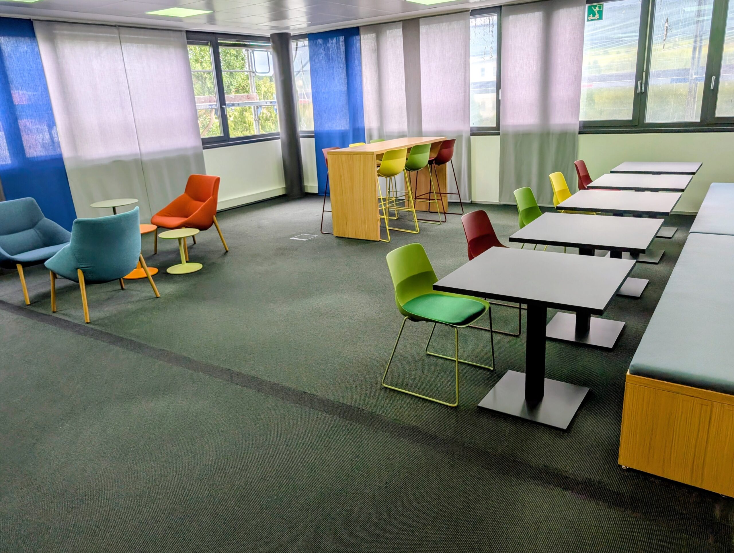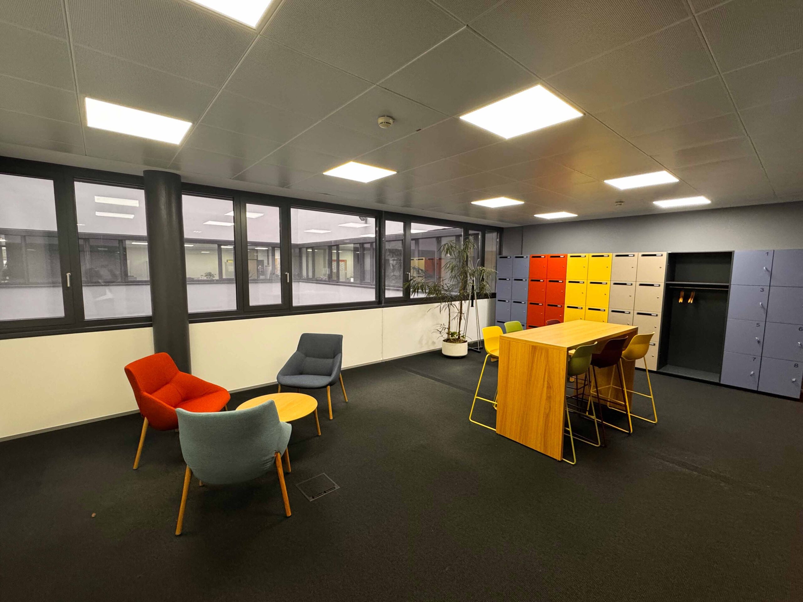 Die neue Farbgestaltung folgt einem durchdachten Konzept: Frische, harmonische Töne schaffen eine positive Arbeitsatmosphäre und fördern Kreativität. Jeder Bereich hat seine eigene Identität, während das Gesamtbild stimmig bleibt.