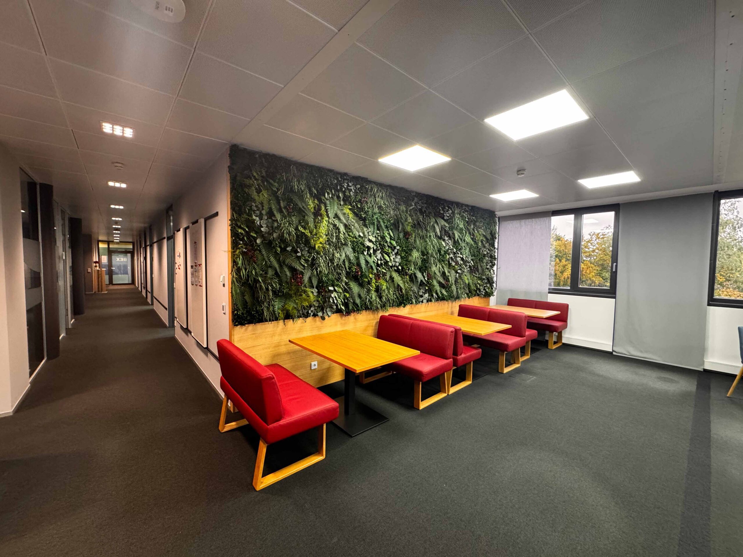 Ein besonderer Hingucker ist unsere Pflanzenwand, die nicht nur optisch begeistert sondern auch für eine angenehme Atmosphäre sorgt. Die Verbindung von natürlichen Elementen mit modernem Design lädt zum Wohlfühlen ein.