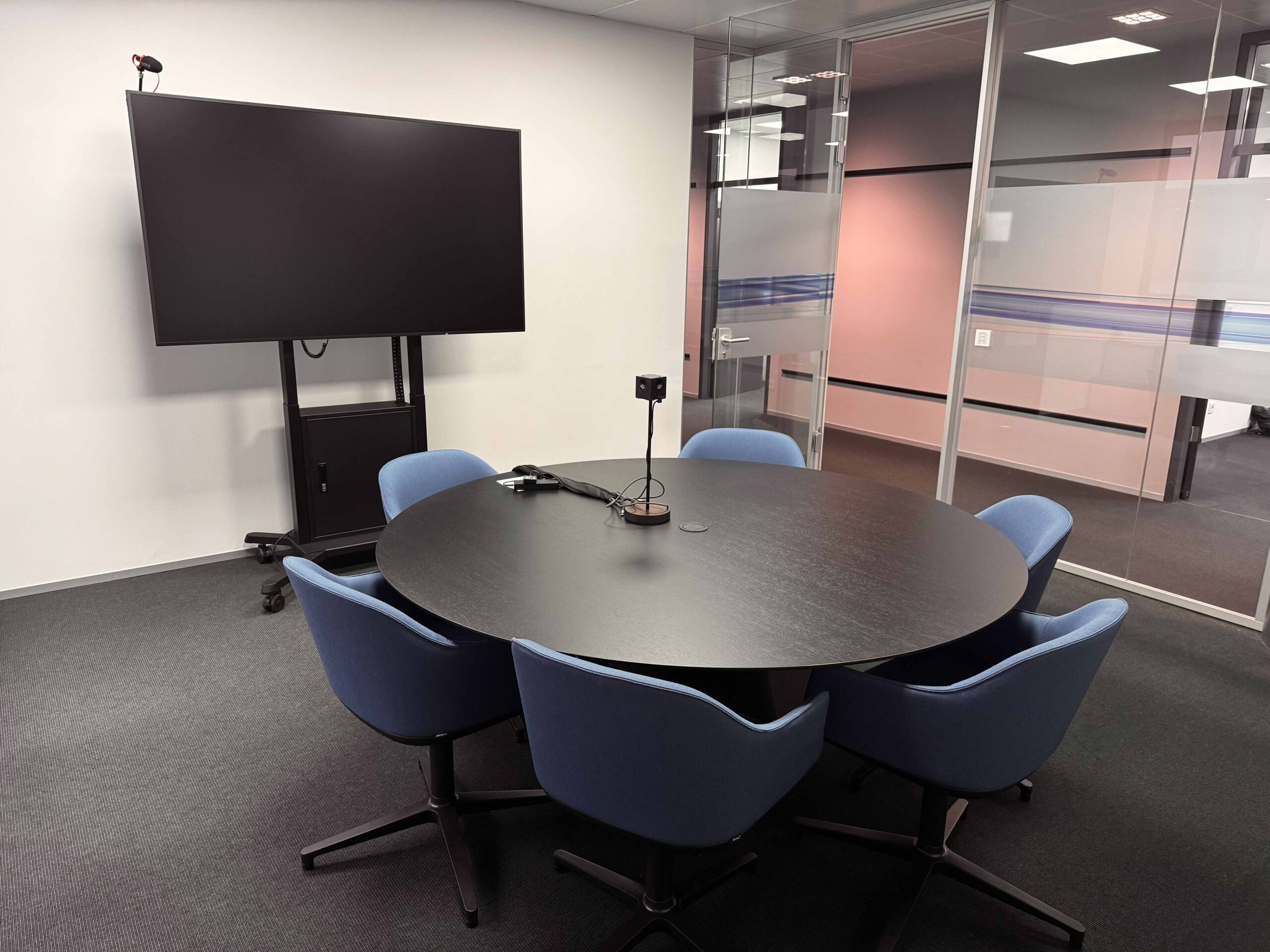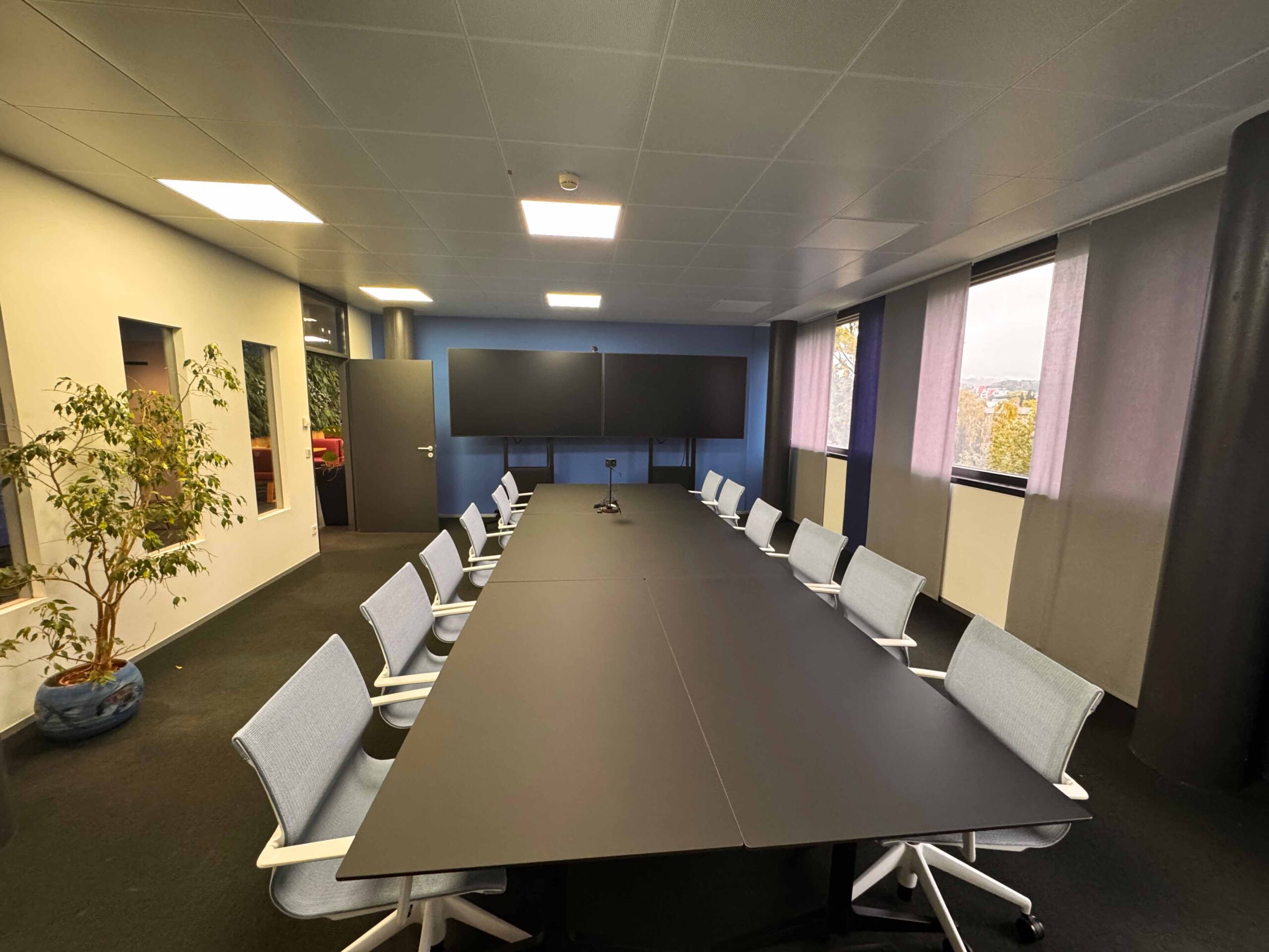 Im Anschluss daran folgt ein großer Besprechungsraum, der mit zwei wuchtigen Bildschirmen, moderner Audiotechnik und Kameras ausgestattet ist, sodass auch hybride Meetings ohne Barrieren in Form von schlechtem Ton oder Bild stattfinden können. Mit großen Fensterausschnitten ist der Raum separat und schalltechnisch abgeschirmt, fügt sich jedoch optisch in die offene Bürolandschaft ein.