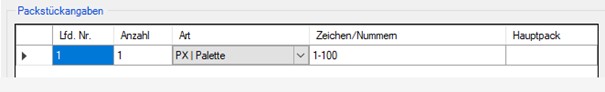 Achtung: Die Angabe in der Spalte „Zeichen/Nummern“ muss in beiden Positionen identisch sein. Die Angabe des Hauptpack muss auf der ersten Position „leer“ bleiben. Die Angabe Hauptpack „1“ auf der 2. Position bezieht sich dann auf Position 1.