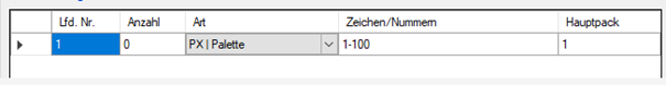 Mit der Spalte „Anzahl“ ist die Anzahl der Art (=Palette) gemeint und ist daher mit „1“ anzugeben.