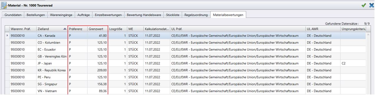 Sollte es sich bei dem Material um eine Eigenfertigung handeln, ist das Kalkulationsergebnis (und damit der Grenzwert) ausschlaggebend für die Präferenzaussage. Hierbei wird der kalkulierte Grenzwert pro Land mit dem im Kundenauftrag stehenden Verkaufspreis abgeglichen. Sobald der Grenzwert erreicht oder überschritten wird, kann eine Präferenzberechtigung ausgewiesen werden.