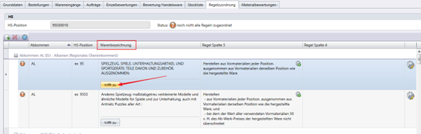 Die Software kann eine derartige Spezifikation nicht vornehmen und ist somit auf den Anwender angewiesen. Dieser muss eine (manuelle) Entscheidung treffen, ob die Warenbezeichnung für die hergestellte Waren anwendbar ist oder nicht. Diese manuelle Entscheidung kann entweder über das Material direkt (Stammdaten >> Material >> Regelzuordnung) oder aber über die Listenregeln (Datenservice >> Listenregeln) getroffen werden.
