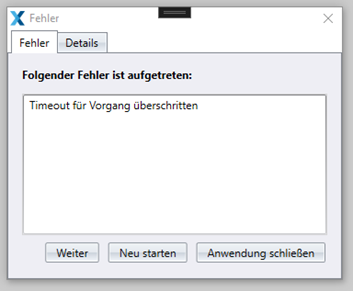 Eine Timeout-Meldung wird ausgegeben, wenn eine Abfrage beim GENESYS Server länger als zwei Minuten andauert und kein Ergebnis zurückgeliefert wird. Um den Client des Benutzers nicht unnötig lange zu sperren, wird die Timeout-Meldung ausgegeben. Im Hintergrund wird die Aufgabe weiter ausgeführt. Es wird hierbei zwischen drei Szenarien, bei dem die Fehlermeldung auftreten kann, unterschieden: